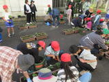 大勢の地域の方にお世話になりました。子育て支援協議会副会長の坂根さんから花の植え方について教えていただき、その後地域に分かれて、色とりどりのビオラを植えました。