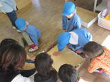 今日は、年長さんがこま回しをするためのこま回し場を作って持ってきてくれました。細部までこだわって作られています。1年生はそれを見て大興奮です。年長さん、ありがとう!